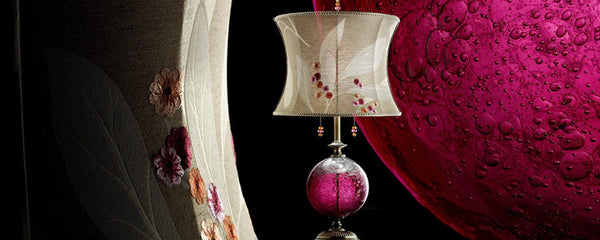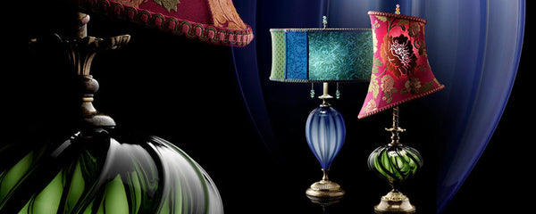 While our designs set us apart, we are known for the high quality of our materials and workmanship. Each lamp is made from solid brass and features vibrant glass that is hand blown by accomplished artisans. The distinctive shades are sewn from embroidered silks and other elegant fabrics. The nature of our materials and processes makes each lamp unique; no two will be exactly alike.