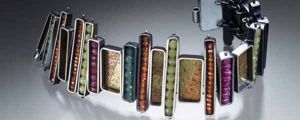 “After three decades, I’m still fascinated with the use of different materials and textures. It’s the design, though, that guides my work from beginning to end. Each piece can be viewed as a small kinetic sculpture dancing with the human form.” Susan Kinzig