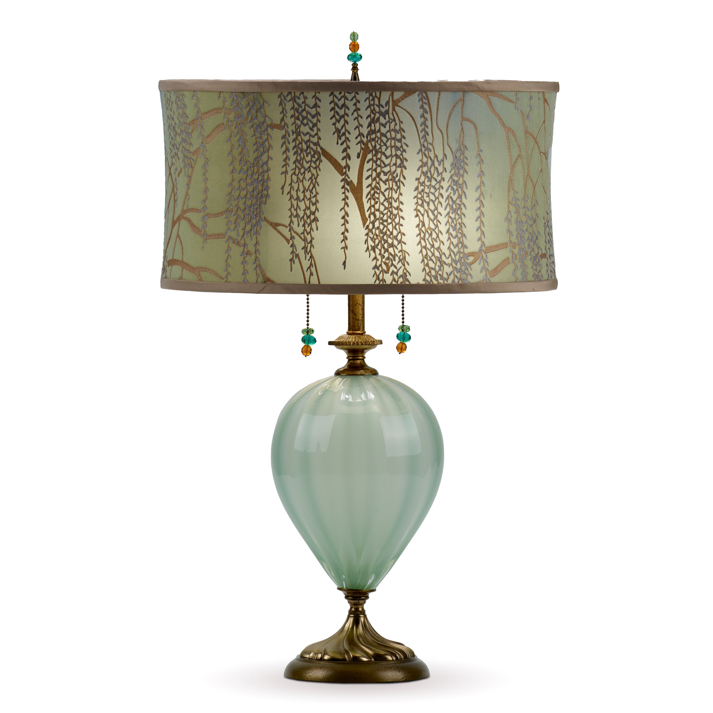 Amy features a sea foam blown glass base. Its simple oval shaped shade is covered in Kevin O'Brien willows fabric in the ice colorway. Amy has a double bulb socket and is finished with beaded pulls and a beaded finial.