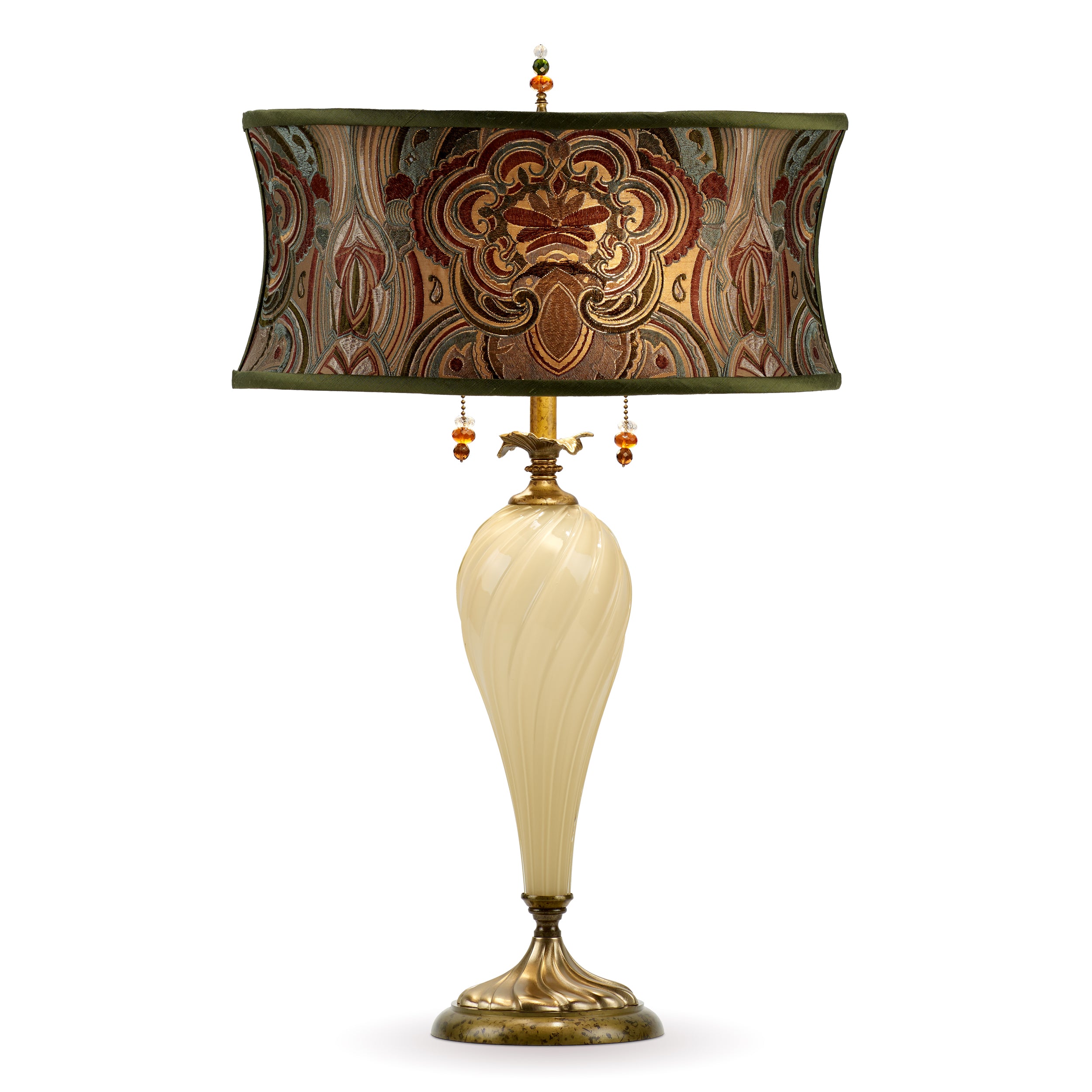Anita has tall creamy blown glass and a curved oval shaped shade covered in an intricate embroidered fabric in green, brown, gold, and slate. Anita has a double bulb socket and is finished with beaded pulls and a beaded finial.