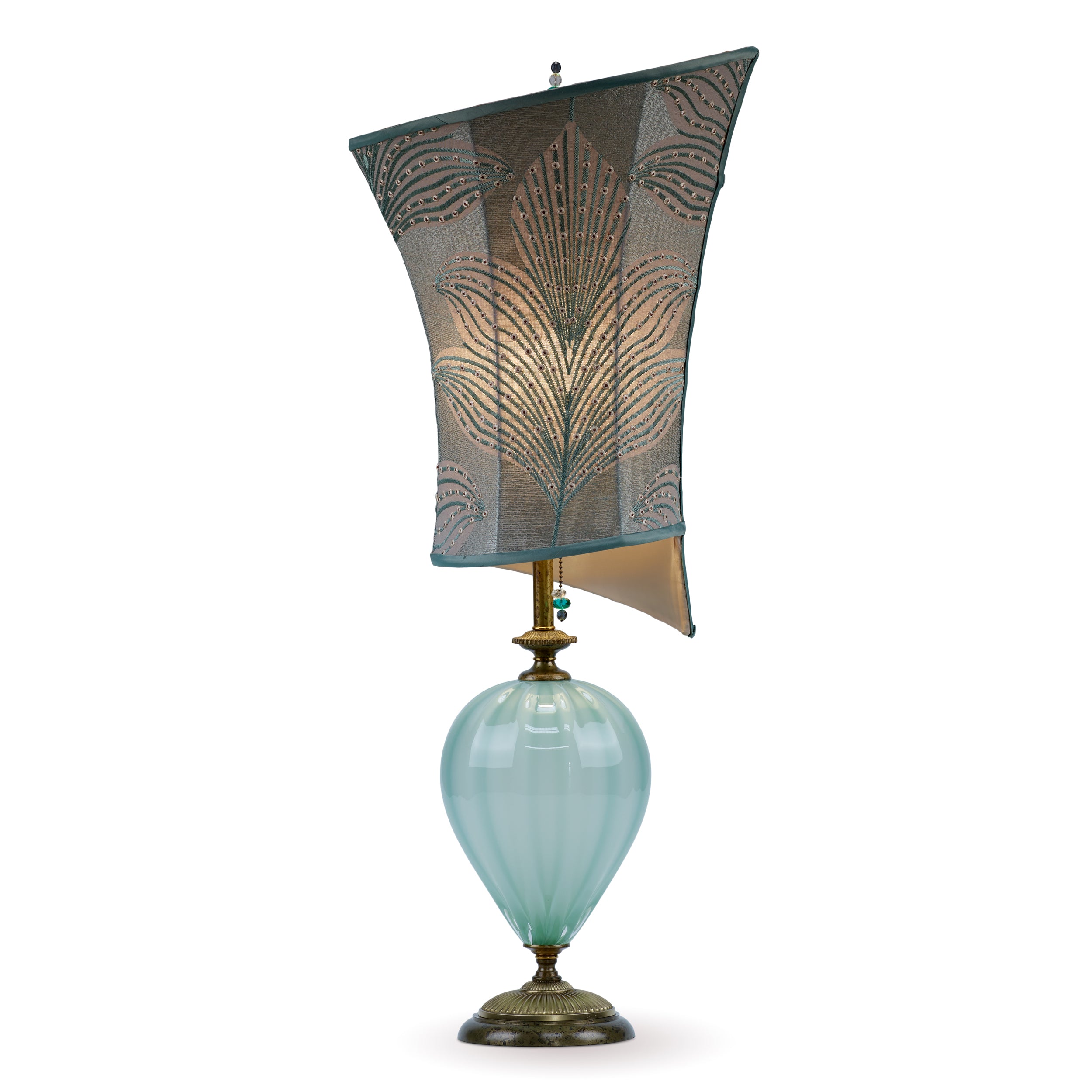 Emily has a distinctive tall, twisted shade and sea foam opaque glass. The sea foam fabric is embroidered in an abstract leaf pattern. Emily has a single bulb socket and is finished with a beaded pull and a beaded finial.