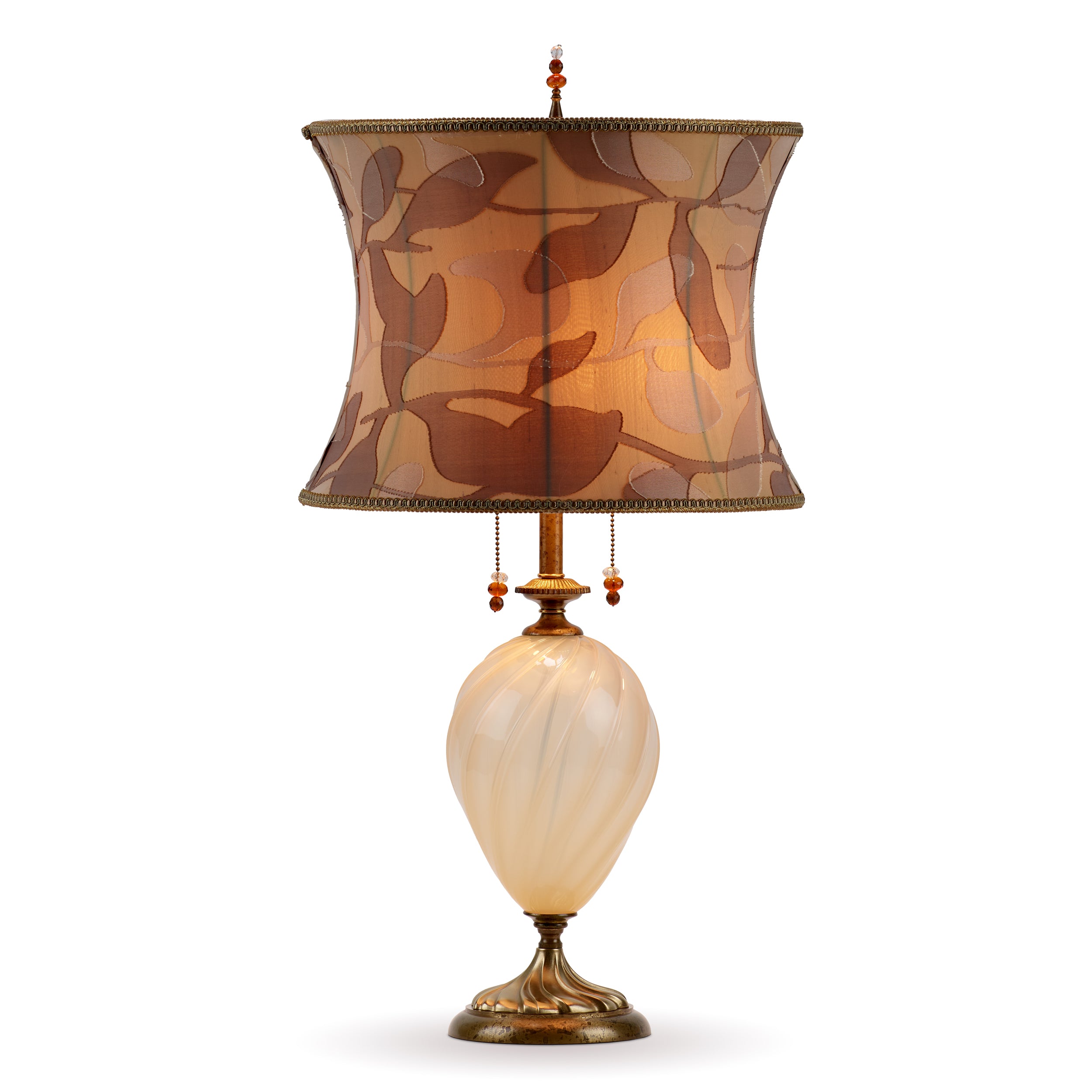 Emma has creamy opaque blown glass and a corset drum shade covered in a gold fabric with a greige and cream leaf design.  Emma has a double bulb socket and is finished with beaded pulls and a beaded finial.