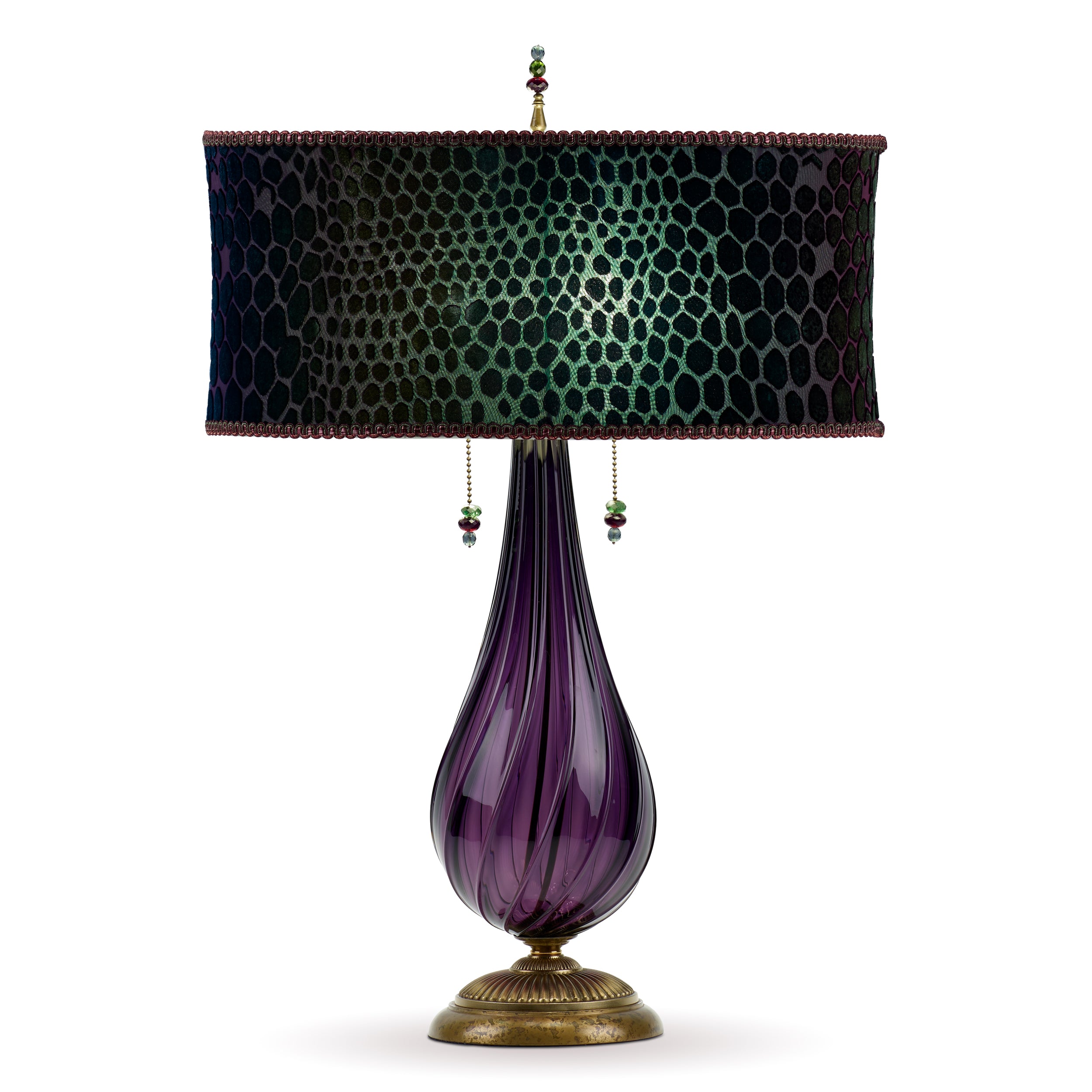 Eva is a dramatic lamp with purple translucent glass and an oval shade covered in Kevin O'Brien snake velvet.  The shade is painted in an ombre which gradates from green to purple. Eva has a double bulb socket and is finished with beaded pulls and a beaded finial.