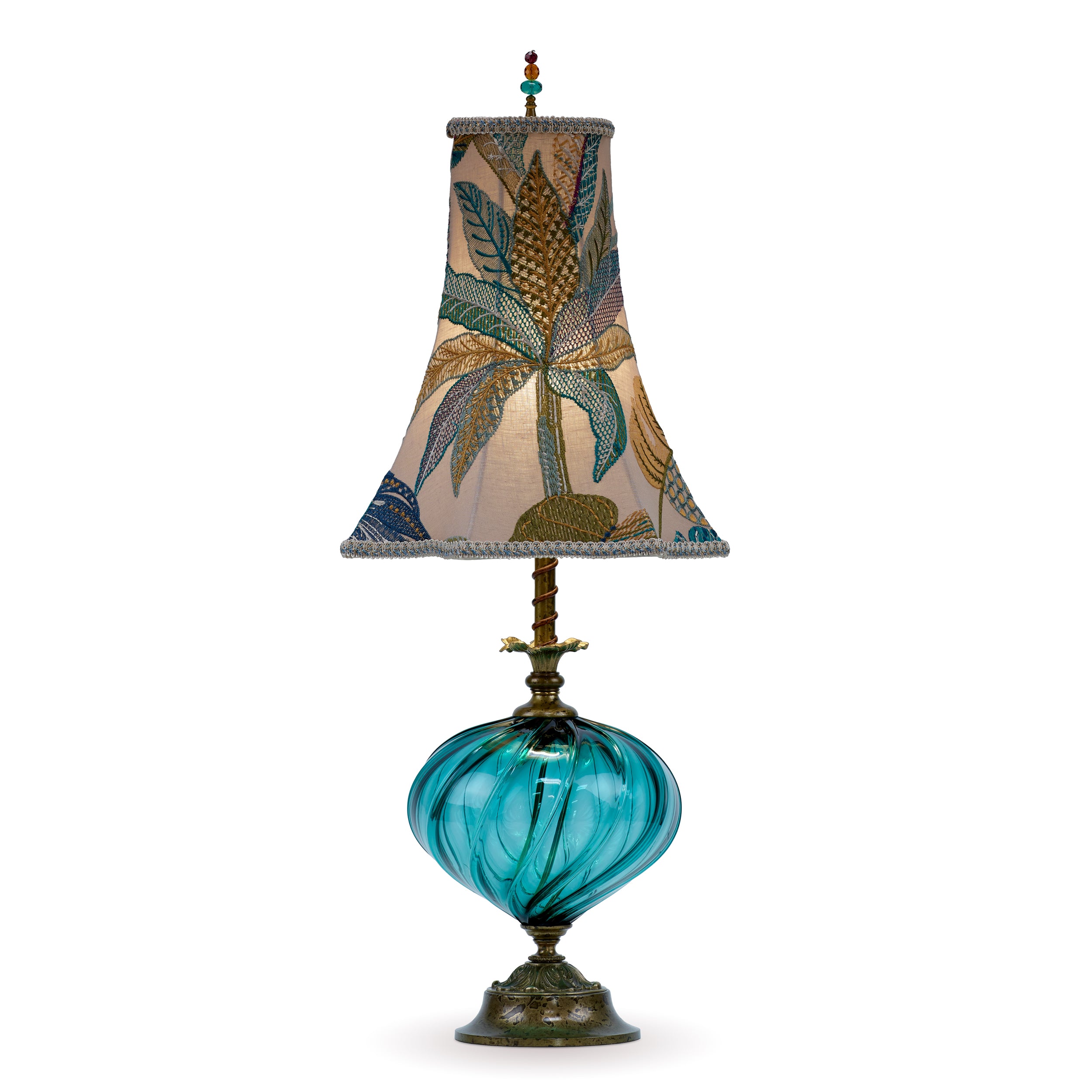 Greta has blue translucent glass with a unique star shaped shade. The shade is embroidered with a botanical design in teal, gold, and purple colors.  Greta has a single bulb socket and is finished with a beaded finial.