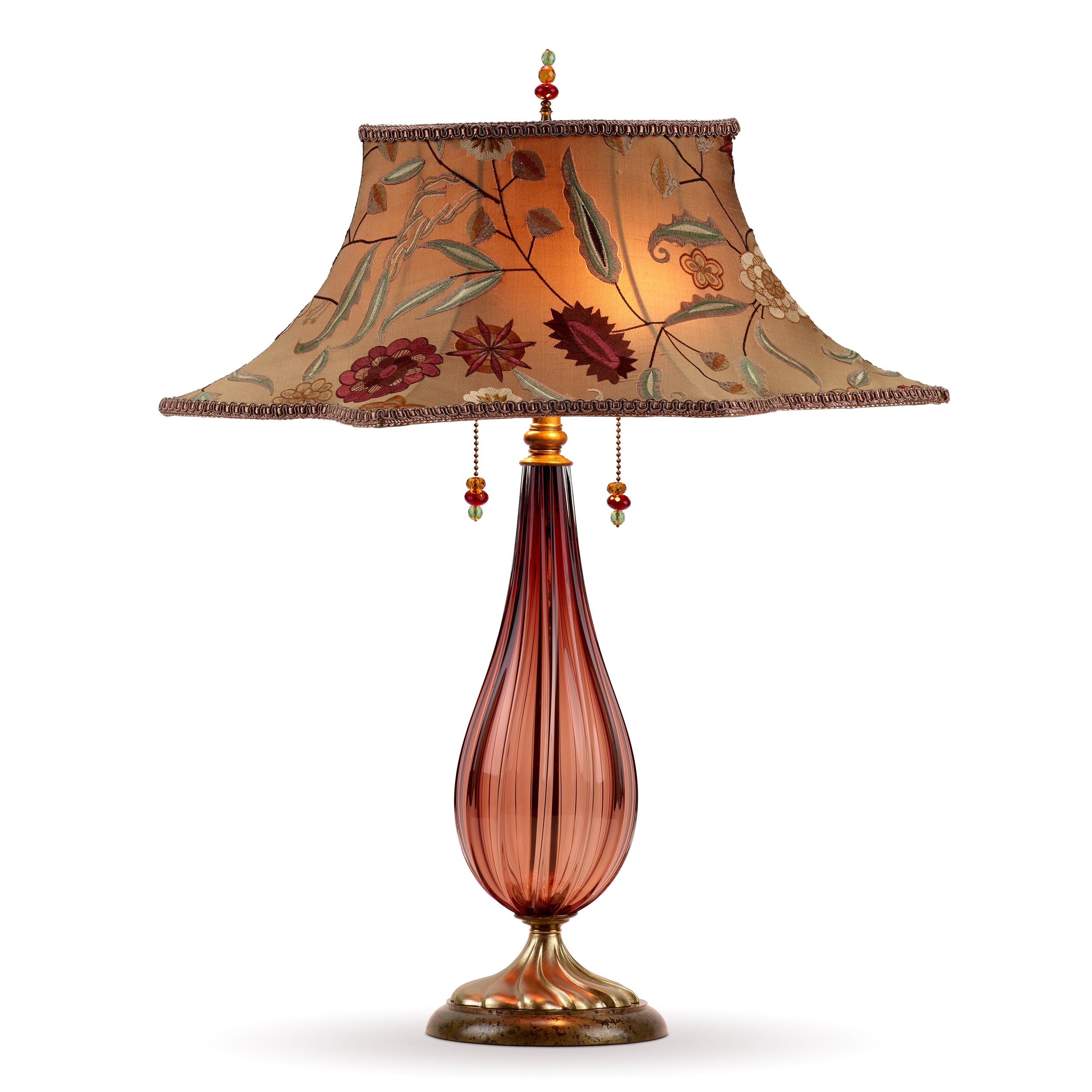 Lily is a unique lamp with burgundy blown glass and a leaf shaped, bell shaped shade. The fabric is embroidered with vines and burgundy, gold and green flowers Lily has a double bulb socket and is finished with beaded pulls and a beaded finial.