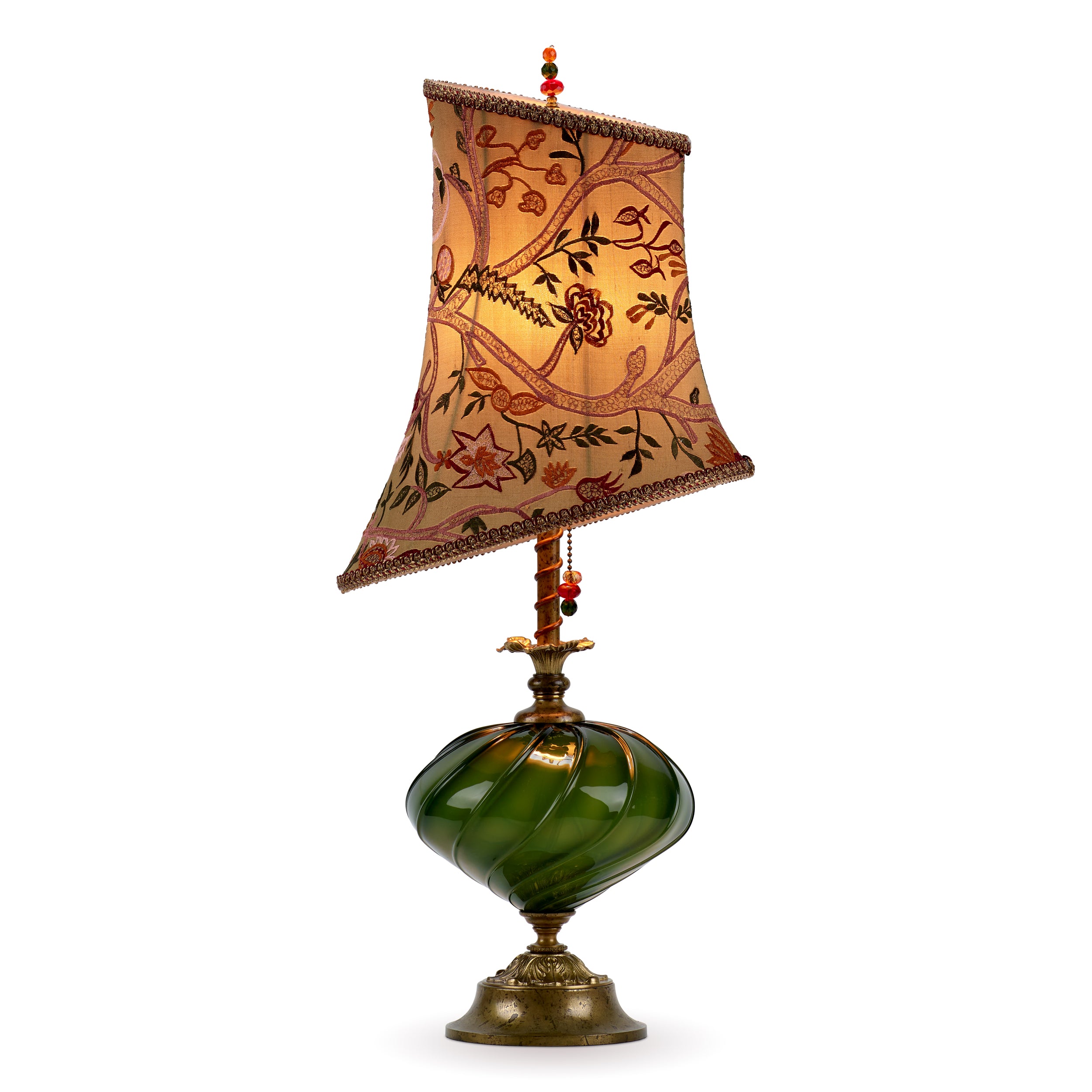 Riley is a whimsical lamp with green blown glass and an asymmetric shade covered in gold fabric embroidered with flowers and vines in burgundy, green, orange, and pink. Riley has a single bulb socket and is finished with a beaded pull and a beaded finial.