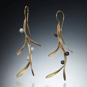 Many of the pieces are inspired by nature, featuring leaves, flowers and buds reimagined as graphic shapes framed in sterling silver and gold vermeil with patterns that are created using pearls, gemstones, polymer clay and mosaic inlays.