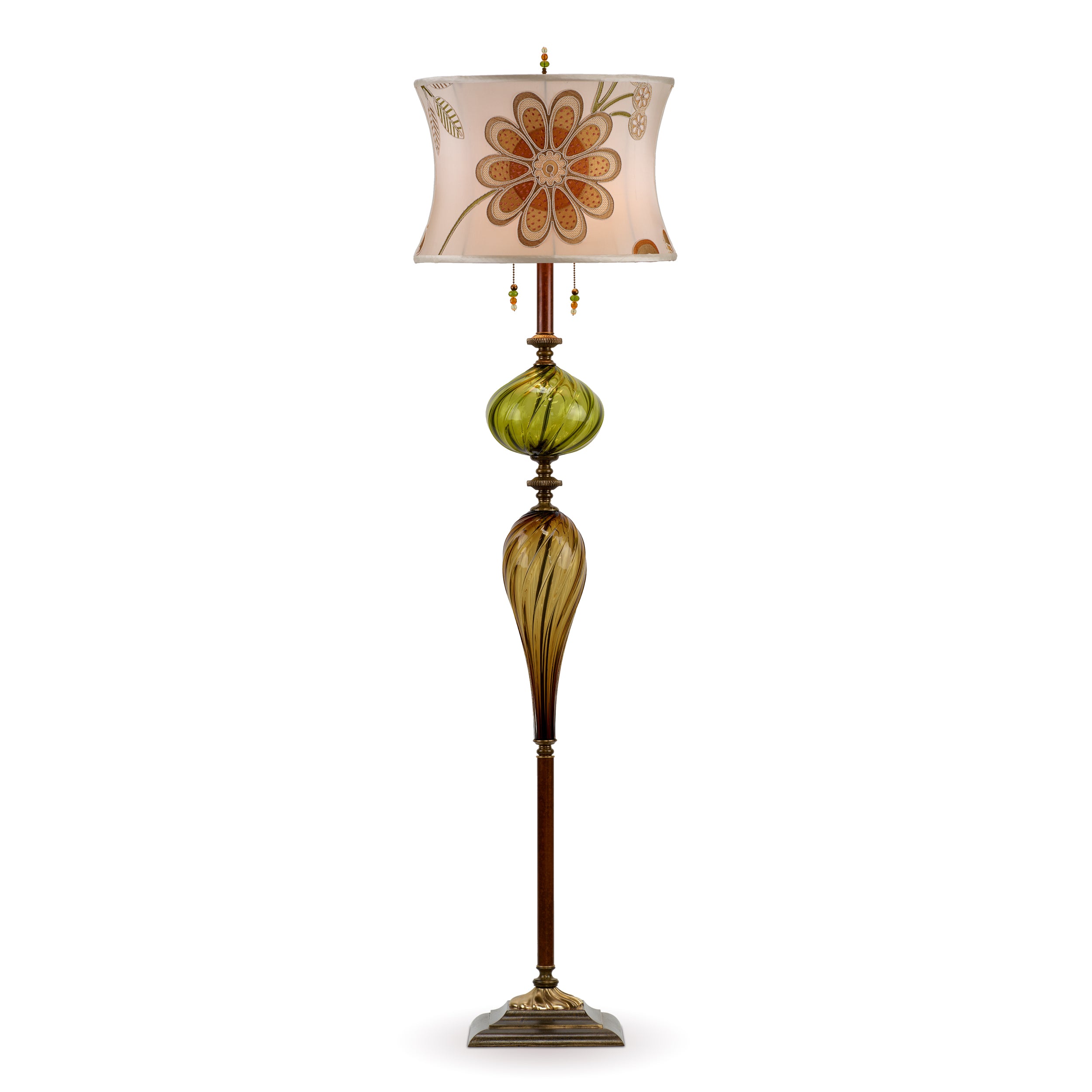 Caleb is a stately lamp with brown and green transparent glass blown glass. Its corset shaped drum shade is covered in embroidered silk with a floral design. The fabric is cream colored silk with copper and gold embroidery. Caleb has a double bulb socket and is finished with beaded pulls and a beaded finial.