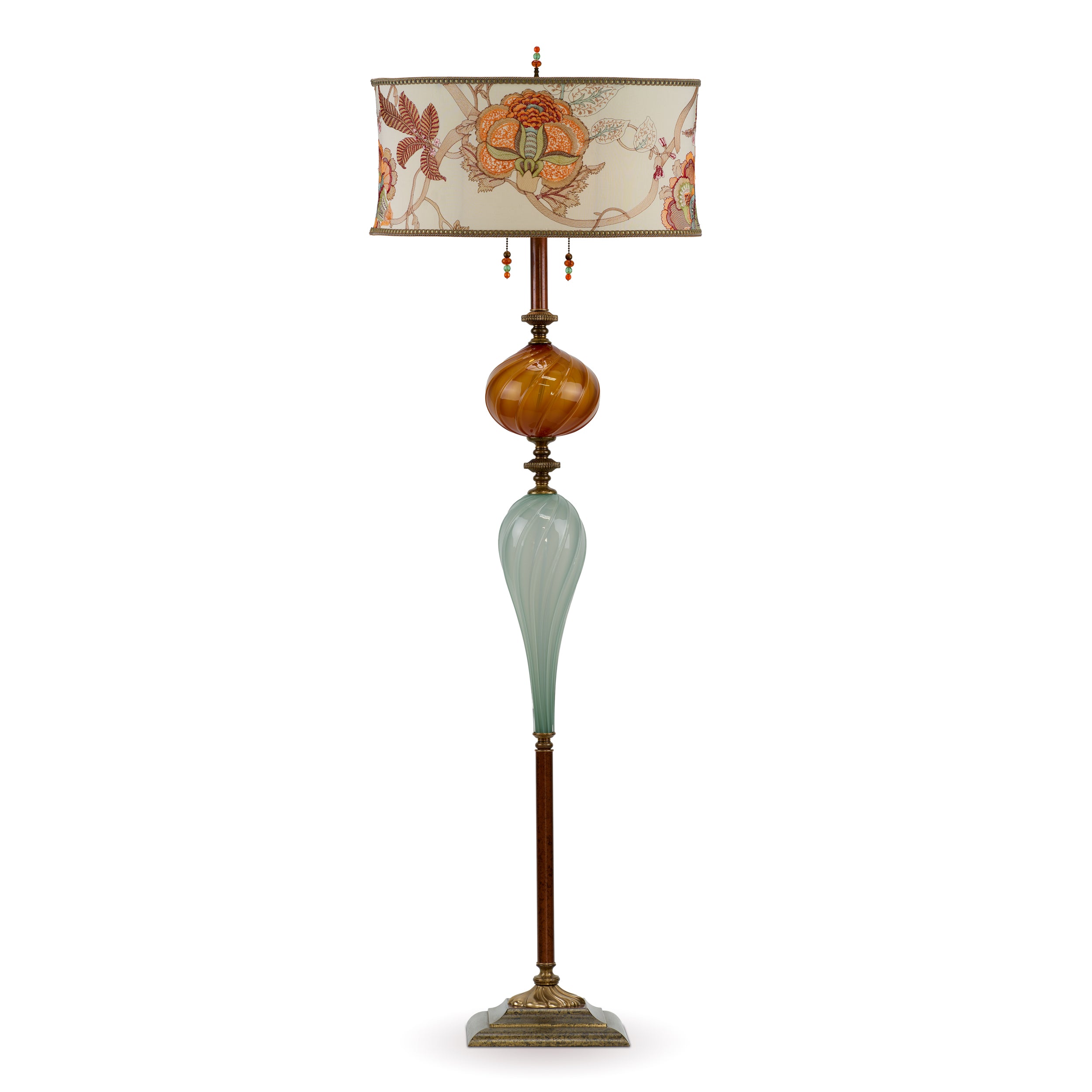 Declan has seafoam and copper blown glass matched with a simple oval shade. The fabric is embroidered in a floral pattern with soft tangerine, mint and red colors. Declan has a double bulb socket and is finished with beaded pulls and a beaded finial.